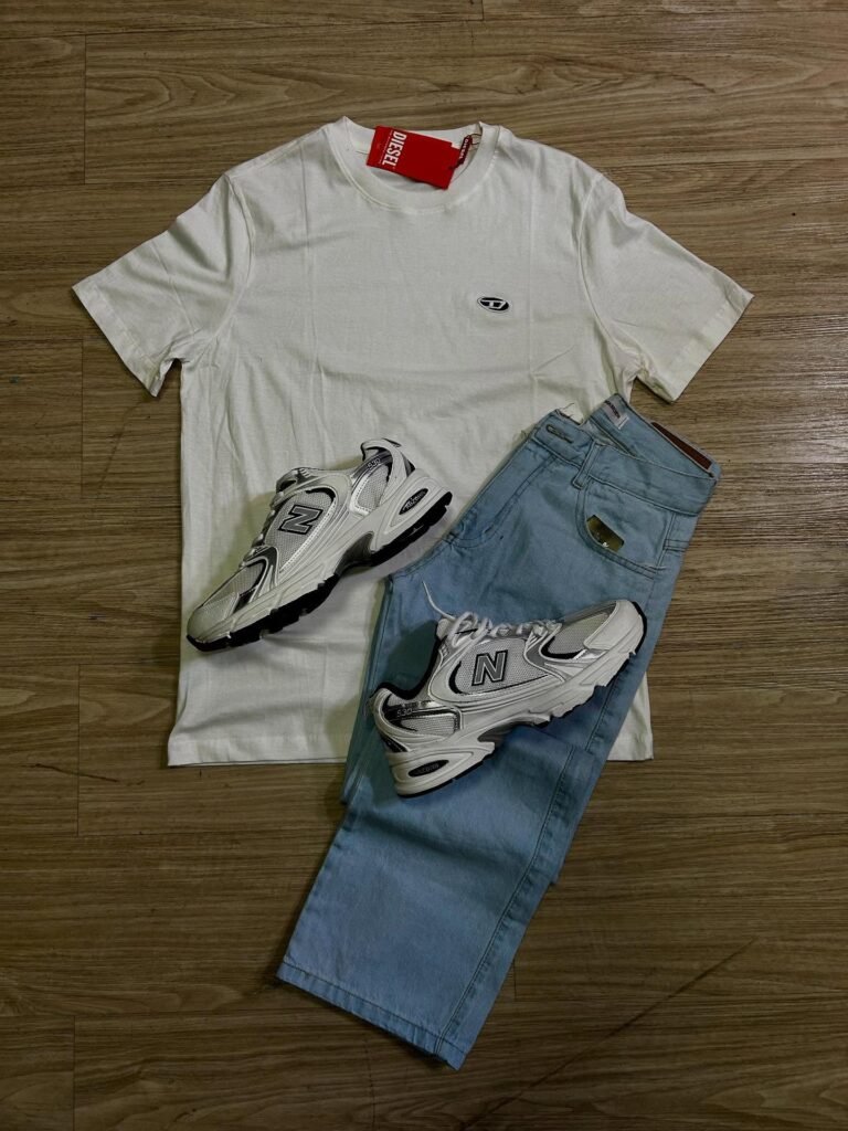 Tênis New Balance 530 branco com camiseta branca Diesel ; combinação clean e moderna com equilíbrio entre conforto e estilo.