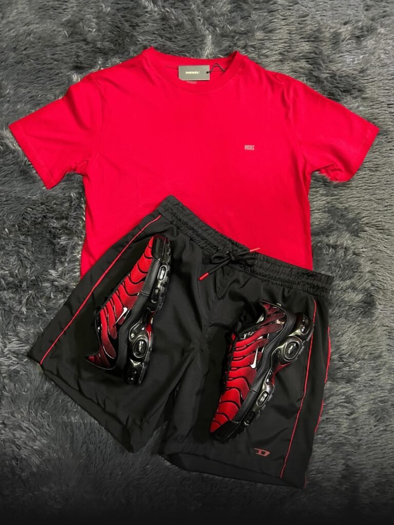 Camiseta Diesel vermelha com tênis Nike Air Max Plus TN vermelho e preto e bermuda esportiva preta ; combinação street impactante.