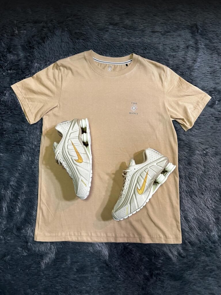 Camiseta Casa Blanca bege com tênis Nike Shox branco com detalhe dourado; estilo casual sofisticado com atitude street.