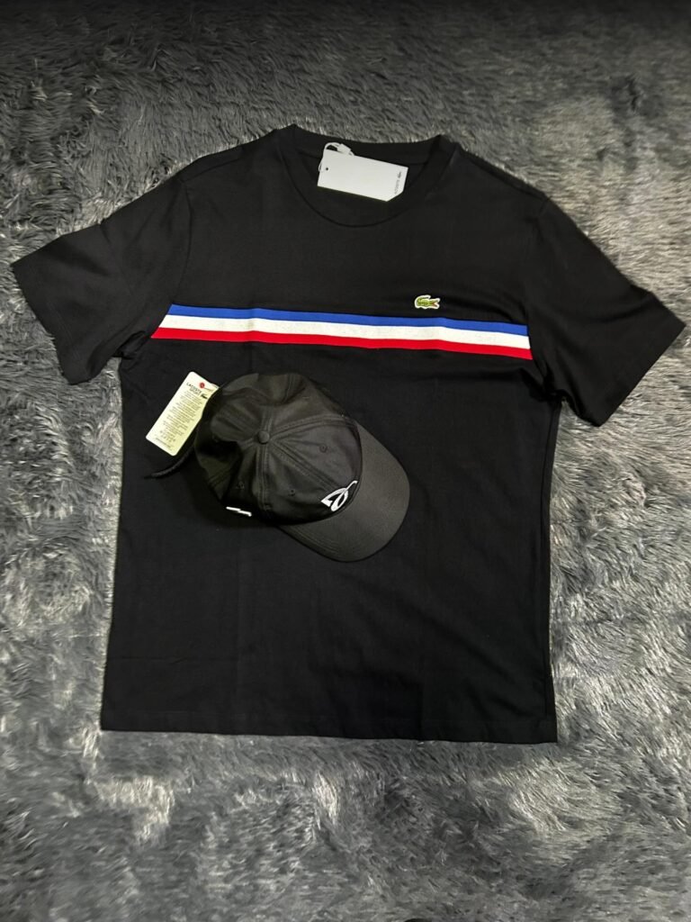 Camiseta Lacoste Sport com faixa tricolor e boné Lacoste preto; visual esportivo sofisticado com identidade francesa clássica.