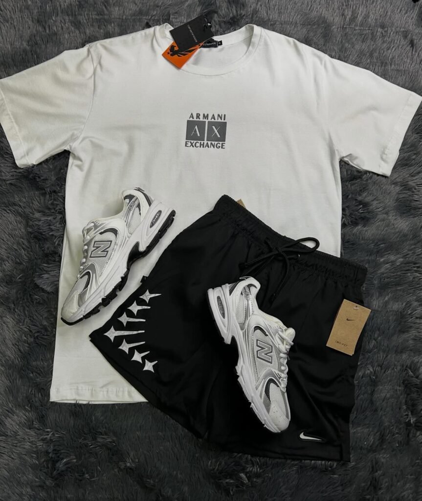 Camiseta branca Armani Exchange AX com tênis New Balance 530 e bermuda Nike Dri-FIT ; combinação premium com conforto tecnológico.