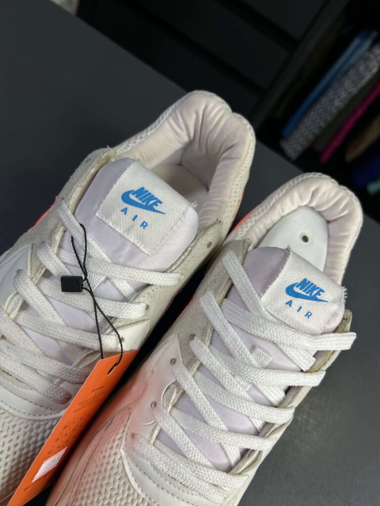 Tênis Nike Air Max branco com logo e costura rosa; base clean com detalhe contrastante que adiciona personalidade e destaque ao visual.