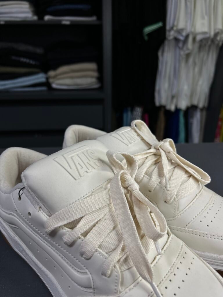 Tênis Vans Hylane White Gum; visual minimalista com sola gum clássica e couro sintético; alto acabamento e identidade skate atemporal.