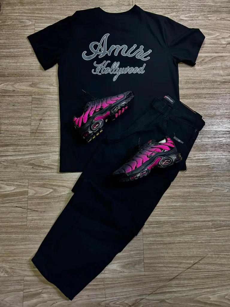 Camiseta Amiri Hollywood com tênis Nike Air Max Plus TN; combinação street premium com presença marcante e identidade ousada.